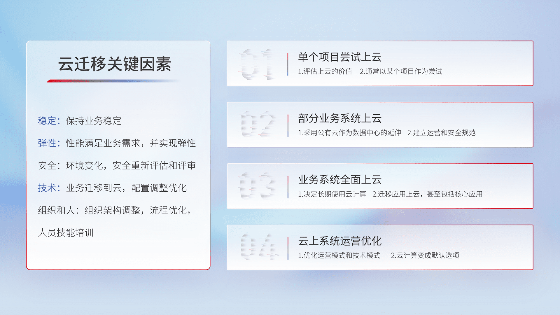 结合实际业务,,,,从规划设计、、云平台选型、、、云原生改造、、、、数据迁移、、集成交付,,迁移全过程为客户识别最佳上云路径,,,,做好风险识别管理,,,,设计网络架构、、身份权限、、安全审计合规、、操作审计、、日志审计、、、、监控告警策略、、、多站点容灾设计等,,对云上基础设施进行整体规划,,提升IT治理水平,,以满足弹性、、高可用、、、高性能的需求。。。。