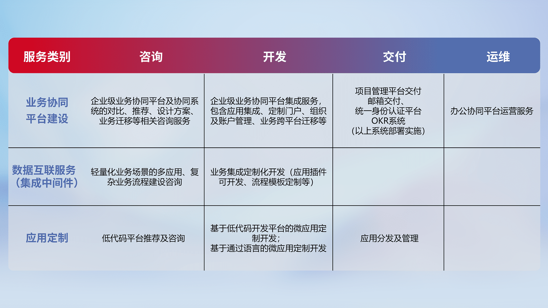 针对钉钉、、、、企微、、、IDaas等平台级产品提供产品的规划、、、、方案、、、交付、、定制化开发等服务,,实现如统一协同办公、、、、智能客户服务、、混合会议管理、、、、智能数据查询、、、等业务场景,,,,实现数字化转型。。。
